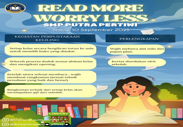 SMP Putra Pertiwi sebagai sekolah yang menitikberatkan pada kemampuan siswa untuk berliterasi dalam proses pembelajarannya melakukan implementasi dengan berkegiatan membaca bersama. Kegiatan tersebut dilaksanakan bertempat di aula sekolah dan diikuti oleh seluruh siswa baik kelas 7,8, dan 9. Tema yang diambil adalah “Read More , Worry Less”, mengandung pesan bahwasannya kekuatiran akan berkurang jikalau banyak membaca karena sejatinya ilmu pengetahuan sangat luas maka apabila kita rajin mencari ilmu yang tentunya dengan banyak membaca maka kekuatiran akan menghadapi kehidupan dunia yang semakin kompleks akan bisa diatasi.